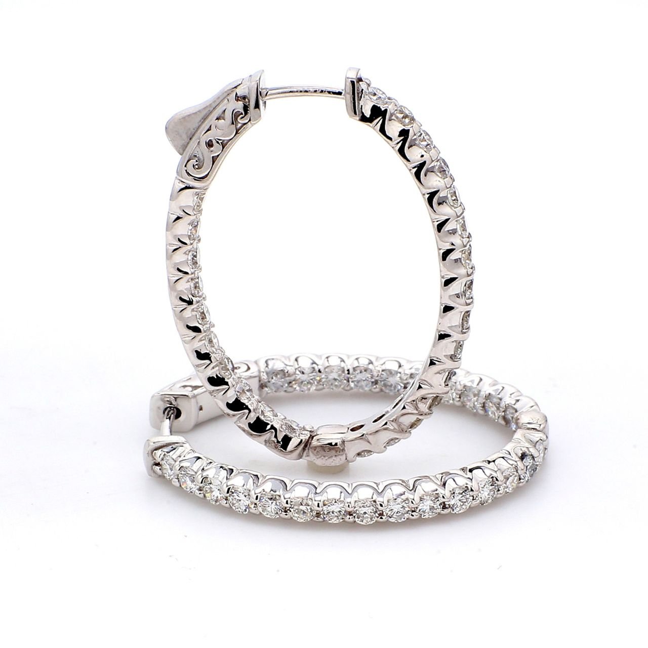 0.75′ Oval shaped inside out hoop earrings with U-prong set (24) round diamonds & with special spring lock. D0.87ct.t.w.