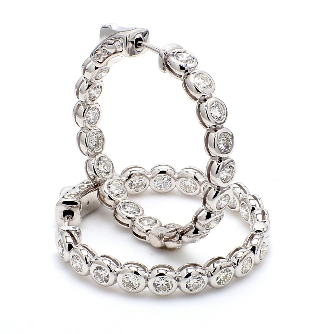 1.25′ Inside out hoop earrings with bezel set (34) round diamonds & with special spring lock. D3.26ct.t.w.