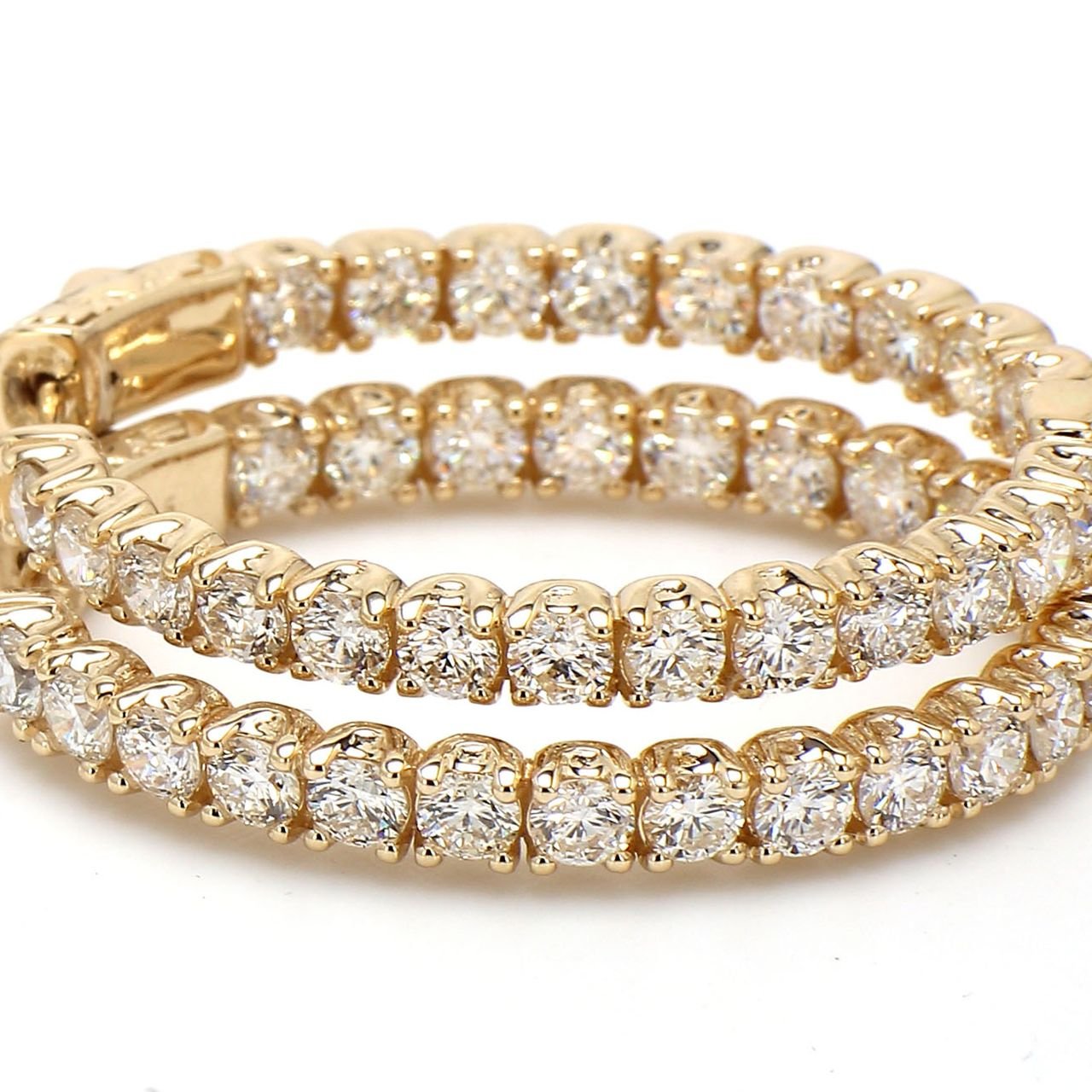 1.25′ Oval shaped inside out hoop earrings in yellow gold with prong set round diamonds. D4.77ct.t.w.