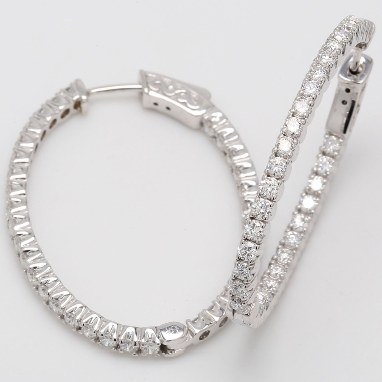 1.5′ Oval shaped inside out hoop earrings with 4-prong set round diamonds. D2.26ct.t.w.