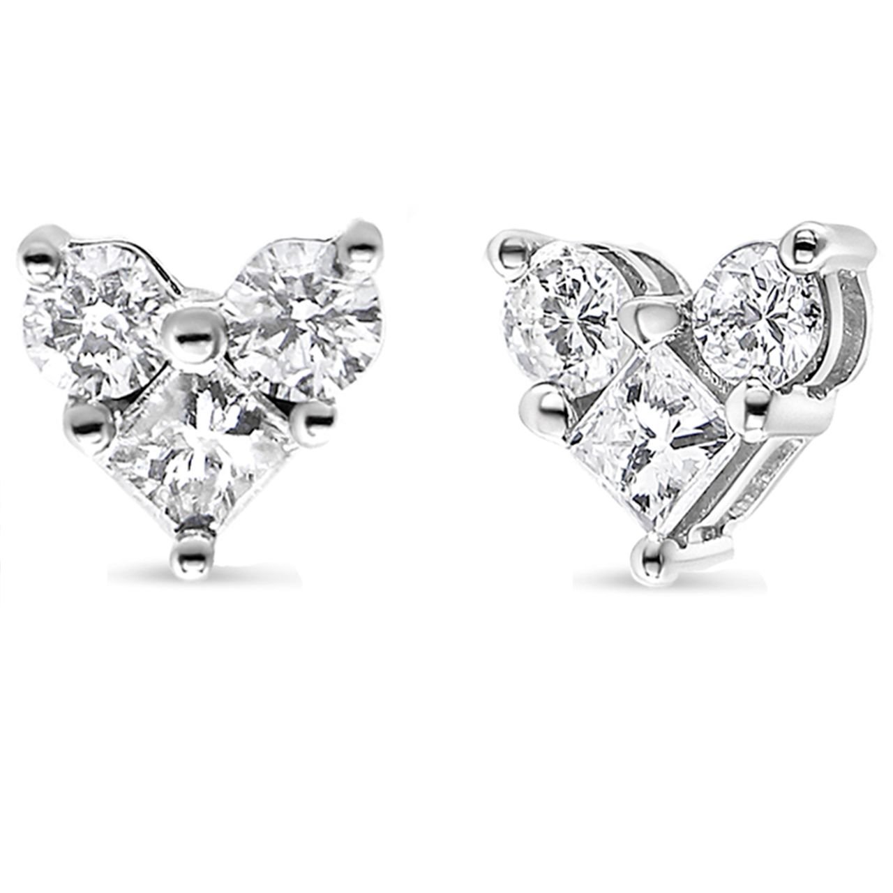 Elegant and petite, these gold and diamond heart studs are the perfect accessory for everyday wear or for any formal occasion. Beautifully set in 10k white gold, a metal that will stay tarnish free for years to come, these earrings are set with 2 round-cut diamonds and 1 princess-cut diamonds, making up the motif of an everlasting heart. These trio diamond studs have a total carat weight of 1/2 c.t, and will a touch of sparkle to your ears!