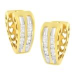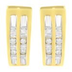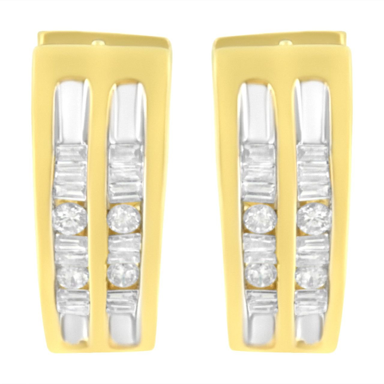 These huggy hoop earrings are fashioned in 10k yellow gold and are literally surrounded with love. Small hearts are cut out into the sides and back of this design. Inlaying the front of the hoop 1/2 a ct TDW of sparkling round and baguette cut diamonds alternate throughout two rows and give this piece its special shine.