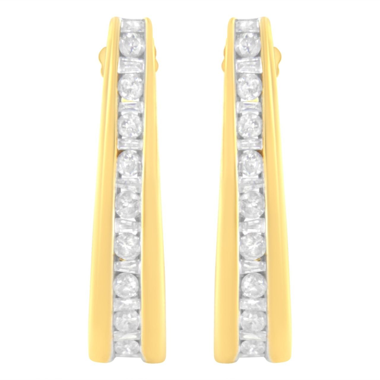 Simple and elegant, these diamond J hoop earrings are perfect for any occasion. Created in 10k yellow gold, this design features sparkling round and baguette cut diamonds that alternate and inlay the front edge of the hoop. This piece captivates with 1 ct TDW of diamonds.