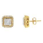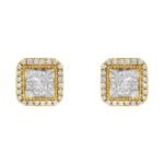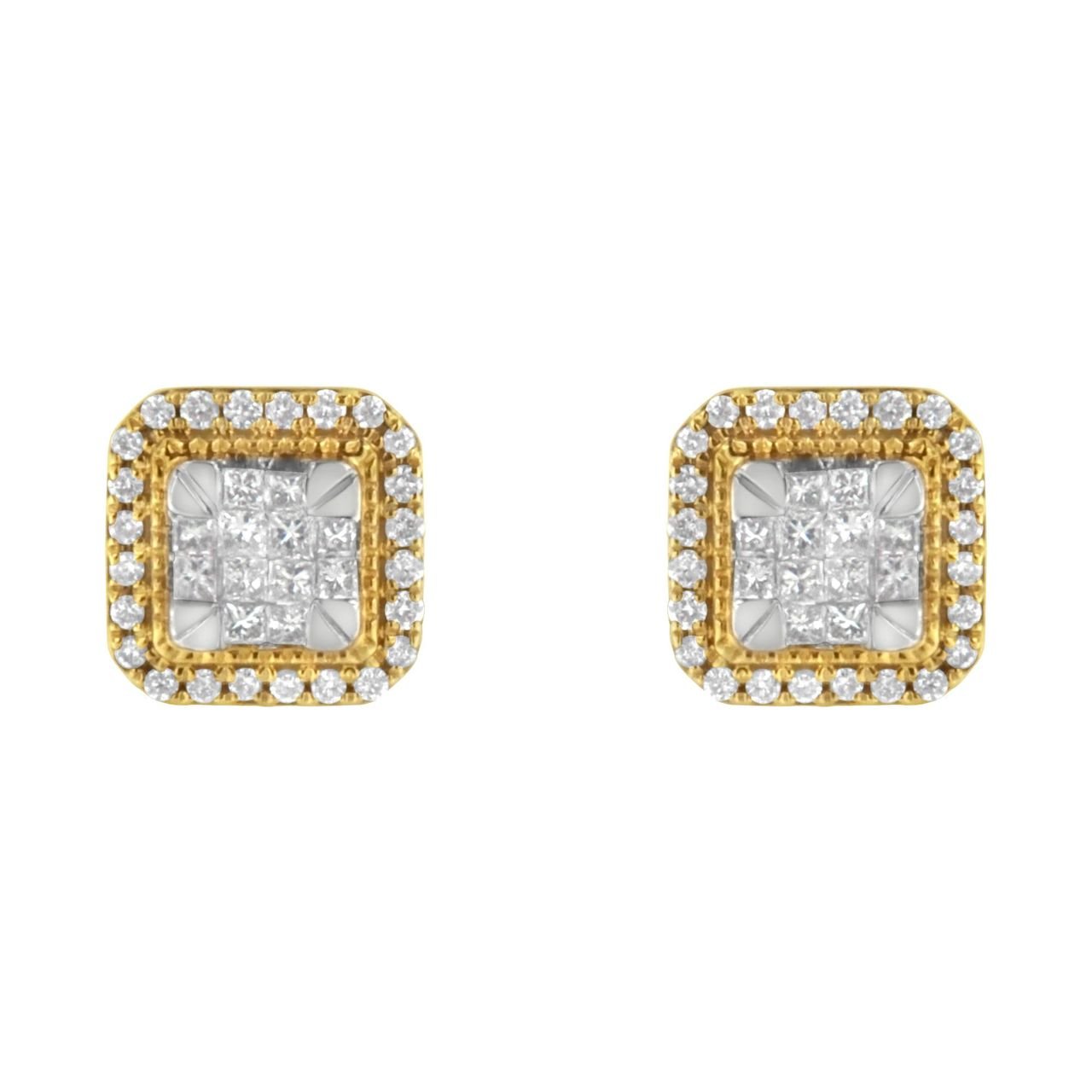 A pair of square diamond cluster stud earring that sparkle with a central cluster of princess cut diamonds surrounded by a halo of round diamonds. Milgrain beading adds a vintage touch to this unique design crafted in 10 karat yellow gold. They have a total diamond weight of 1/2 carat.