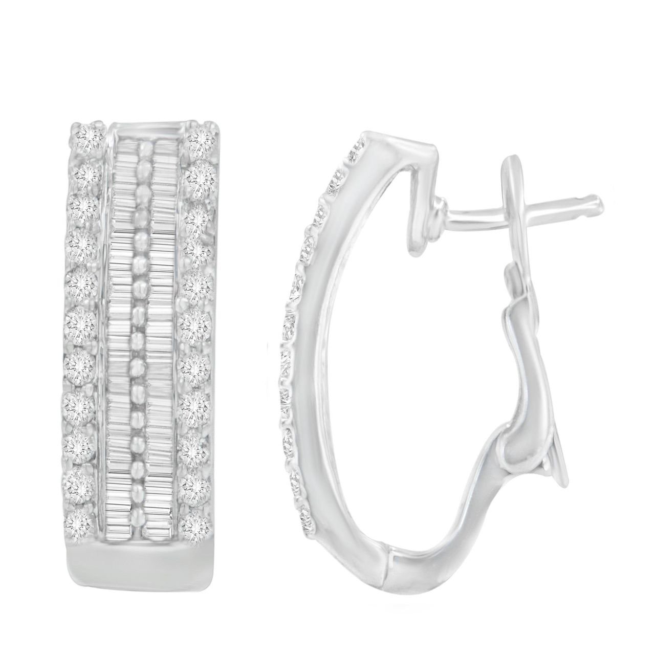 Surprise her with this pair of stunning 14k white gold and diamond hoop earrings. Each elegantly rounded piece is filled with pave and channel set baguette and round cut diamonds. Alternating rows of shimmering diamonds create a classic pattern that invokes a feeling of royalty.
