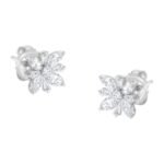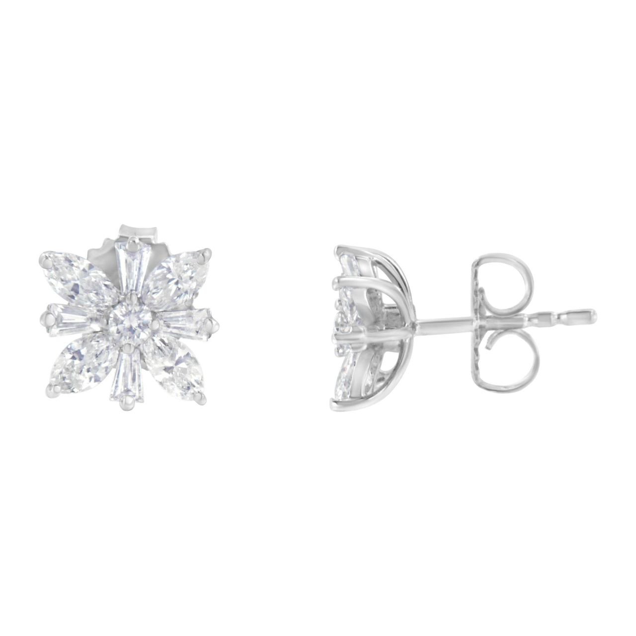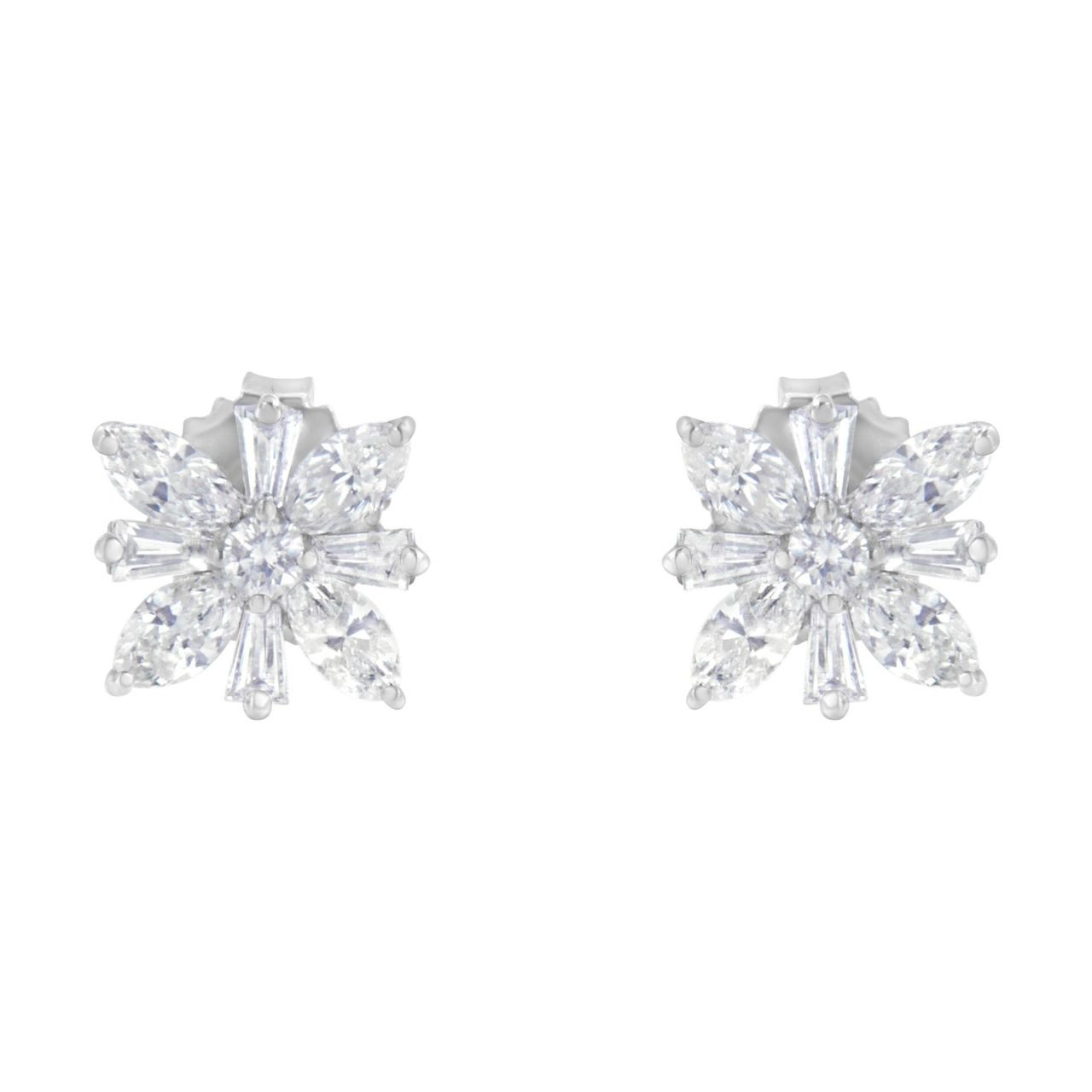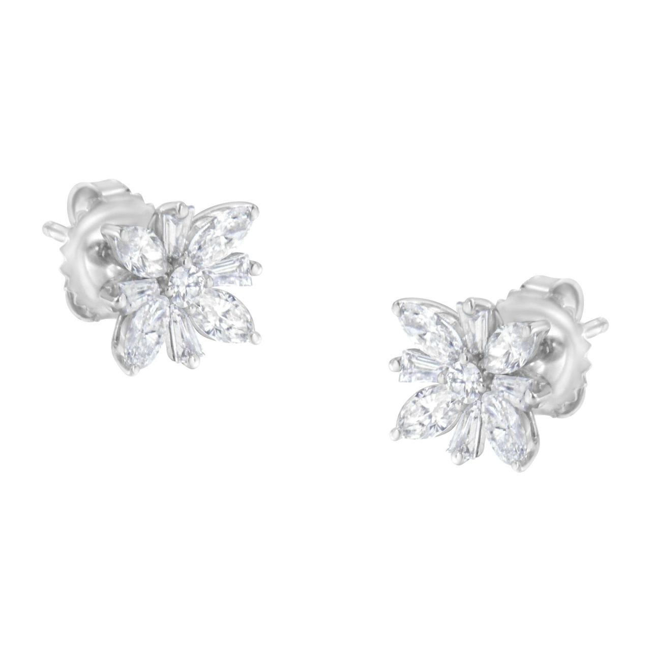 A pair of diamond stud earrings featuring a central round diamond surrounded by marquise and baguette diamonds in the form of a snowflake. These charming earrings are crafted in 14 karat white gold and have a total diamond weight of 1 1/4 carats.
