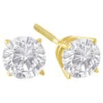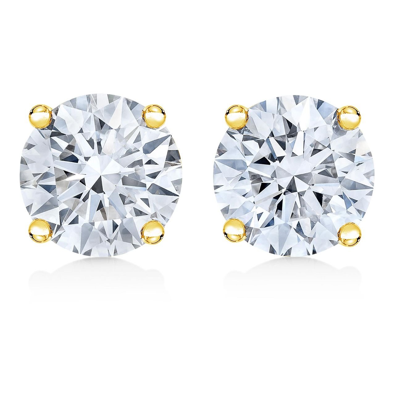 Two gorgeous white diamonds sit in a prong setting on these sparkling stud earrings. Crafted in solid 14k gold, these diamond stud earrings feature a high polish finish. These stunning gold earrings feature round brilliant-cut diamonds, and the timeless four-prong settings are sure to keep the gemstones in place. These simple stud style earrings are subtle enough for casual affairs but sparkle in formal settings as well. Coordinate these earrings with your favorite diamond necklace or other diamond jewelry to create a complete elegant ensemble.