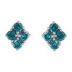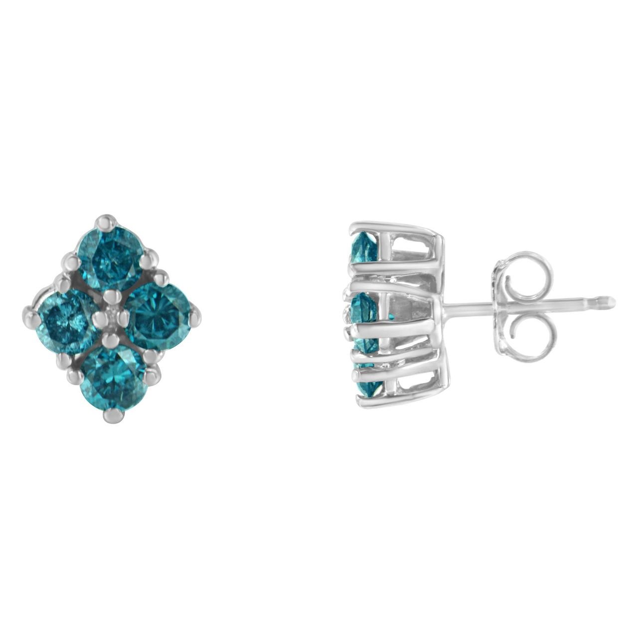 A pair of diamond stud earrings with clusters of four blue treated diamonds. Crafted in 14 karat white gold, they have a total diamond weight of 1 1/2 carats.