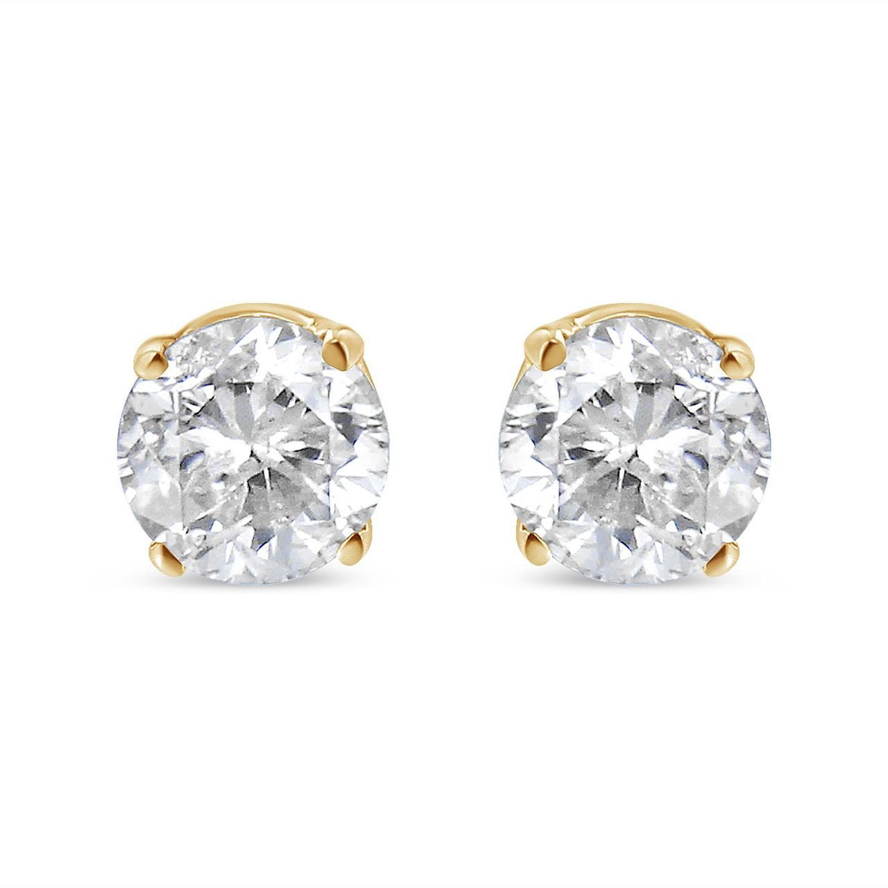 Celebrate any occasion with these classic shimmering diamond stud earrings. Crafted from 14k yellow gold each earring showcases a sparkling round-cut solitaire diamond in a 4-Prong Setting. Dazzling with 1/2 cttw of diamonds and a bright polished shine, these push back stud earrings secure comfortably on your ear. These diamond studs are certified by the AGS as natural, earth mined diamonds. These diamonds are color rated as M-N color, and clarity graded as VS2-SI1 clarity. Make these classic diamond studs yours today!