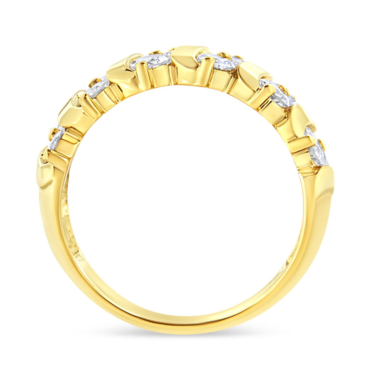Beauty and elegance combined, this gold band ring has a modern and sleek design that will look beautiful on your fingers. Thick 10k yellow gold ‘s’ links alternate with a pair of natural, round-cut diamonds on this 1 carat piece. The diamonds are prong set to give you a classic feel on this unique take on a band.