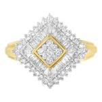 A diamond ballerina ring that features a central square cluster of round diamonds surrounded by a double halo of baguette and round diamonds. Crafted in 10 karat yellow gold, the ring has a total diamond weight of 1 carat.