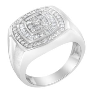 Vividly created from 14-karat white gold, this men’s diamond band is stylish and classic. The top of the elegant ring features a rounded square design. The center flaunts nine round cut diamonds that are prong set into the square pattern. Further, the diamonds are captivated by a halo of sparkling baguette cut diamonds in a channel setting. While the second frame is adorned with a ring of round cut diamonds to add a glittery touch. Make him feel like a king with this diamond band.