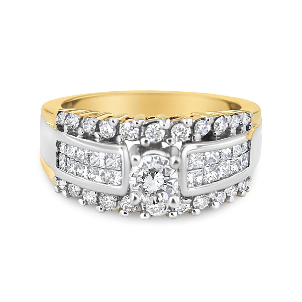 Trade in your simple bands for this glamorous ring with a stunningly bold design embellished with 1 1/2 cttw of natural, sparkling diamonds. The yellow gold band has a streak of white gold through the center that is set with princess-cut diamonds. Round-cut diamonds sit at outer half of this piece, framing a single 1/2 cttw round-cut diamond at the center. You will love the way this ring looks on your finger and lights up any room you walk into.