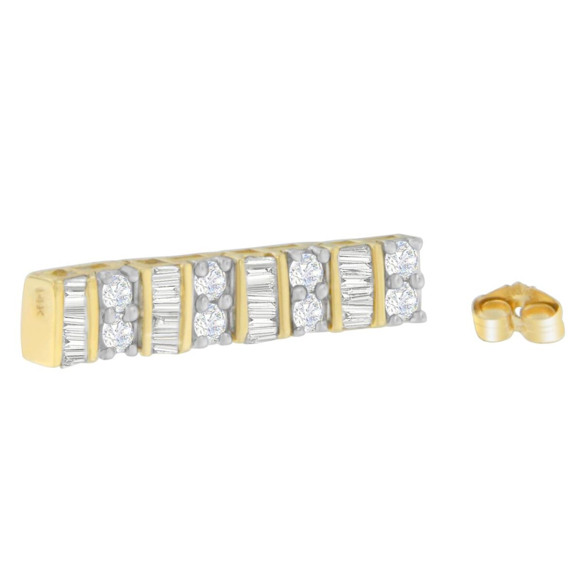 Alternate rows of round and baguette cut diamonds are separated by strips of gold in this elegant pair of 14k yellow gold dangles. In a look that is classic and modern, this pair of push-back earrings are a superlative gift for any occasion.