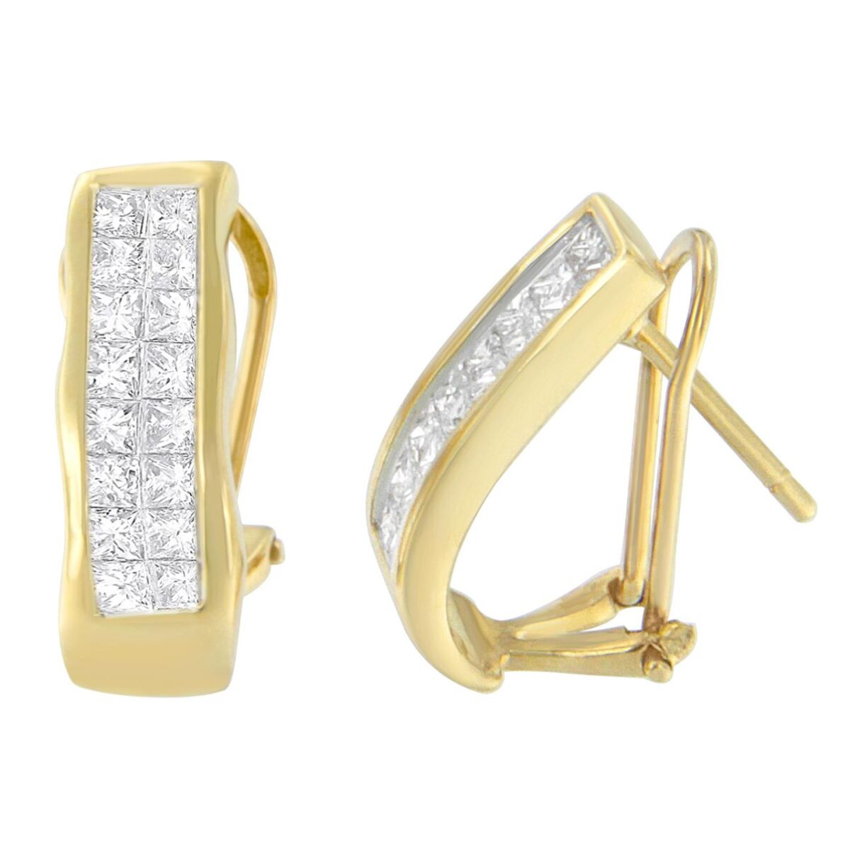 Certain to sparkle, these sophisticated earrings are sure to delight everyone. Created with precious 14 karats yellow gold and featuring an elegant design, the earrings are polished high to shine. The adornment with one carat of sparkling princess cut diamonds makes this pair of earrings look spectacular.
