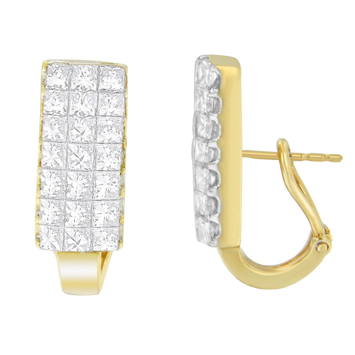 Beautifully crafted of high-quality 14-karat yellow gold, these stunning hoop-hook earrings hold 4 carat of dazzling princess cut diamonds. Polished to a high shine finish, these earrings secure with push-on-screw-off clasp. Wear it up for a casual everyday wear or for any occasion.