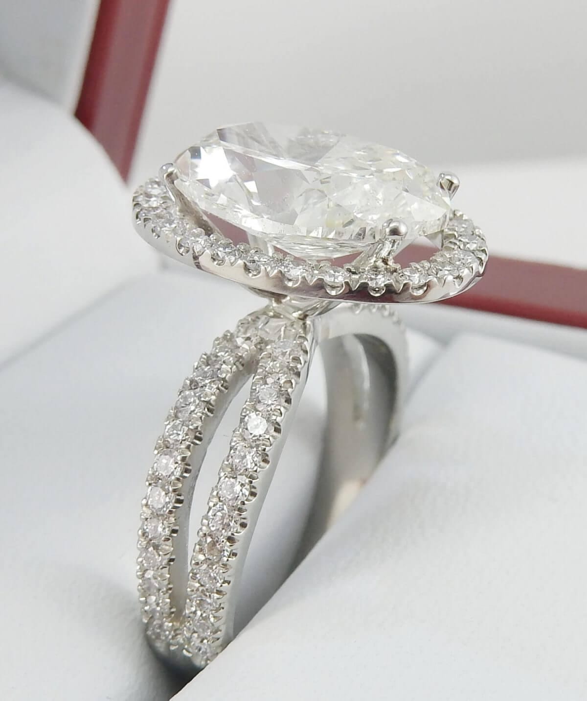 This 4.26ct oval diamond cross-shank halo engagement ring is a perfect blend of a large, exquisite diamond, a beautiful halo, and a modern cross-shank design. It’s more than just a ring—it’s a symbol of love and sophistication, designed to be cherished for a lifetime.