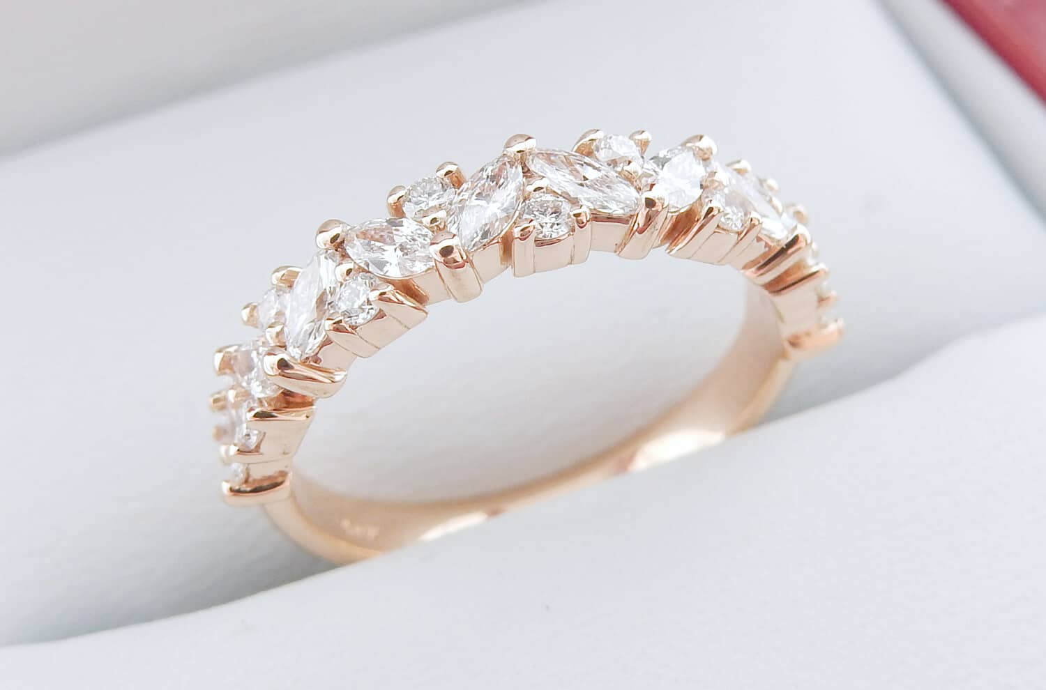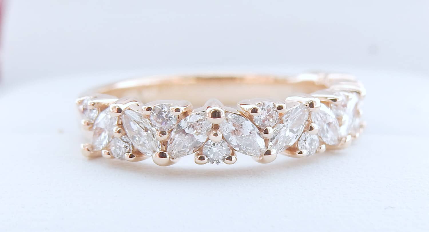 This 18k Rose Gold mixed shape wedding band features Marquise and Round Brilliant Cut natural diamonds with F-G color and VS2-SI1 clarity.