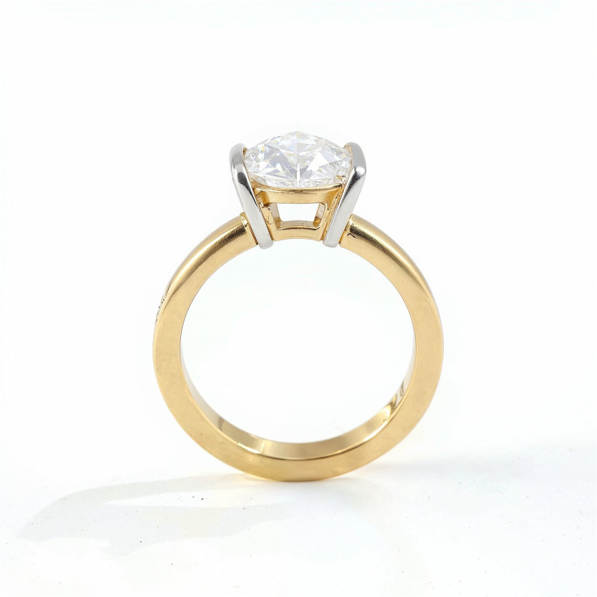 Striking and modern, this two-tone “floating” style engagement ring brings a fresh twist to classic elegance. A brilliant 1.30 ct VS2 round diamond appears suspended between 18K yellow and white gold hands—pure visual poetry. Stop by our downtown Vancouver showroom to see this design in person, order it as is, or customize every detail to reflect your own love story.